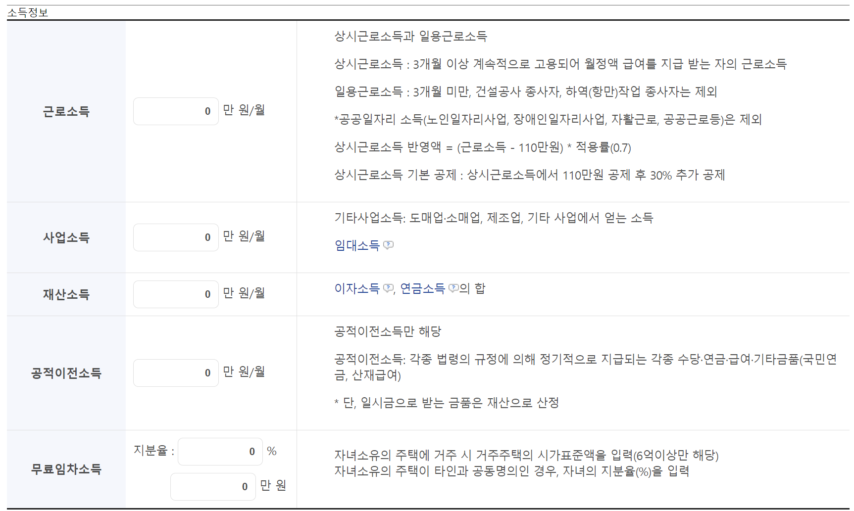 근로소득에서 기본공제액인 110만원을 공제하고 그 금액에서 30%를 추가 공제해줍니다. 단, 일용근로소득과 공공일자리소득, 자활근로소득은 근로소득에서 제외됩니다. 기타소득은 사업소득과 재산소득, 공적이전소득, 무료임차소득이 포함되게 됩니다.