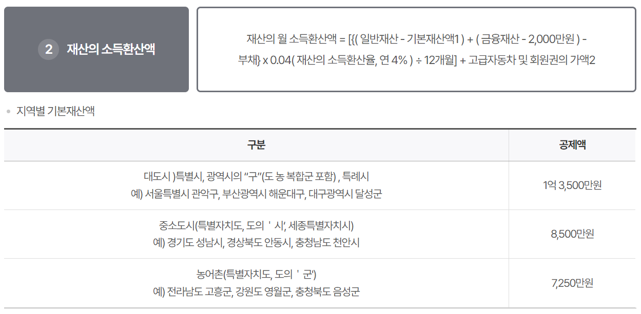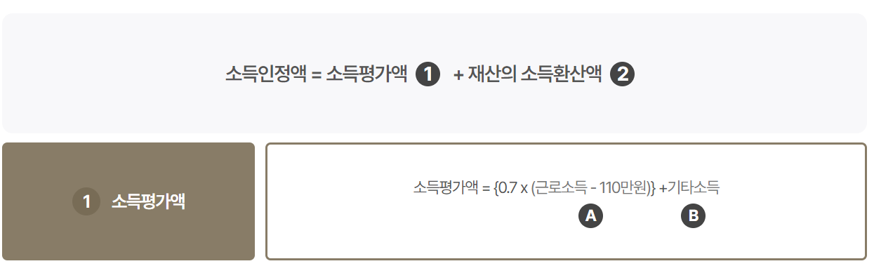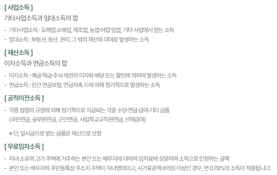 소득은 근로소득 뿐만 아니라 보유하고 있는 재산을 월 소득으로 환산한 소득인정액으로 산정 방식은 아래와 같이 계산됩니다.