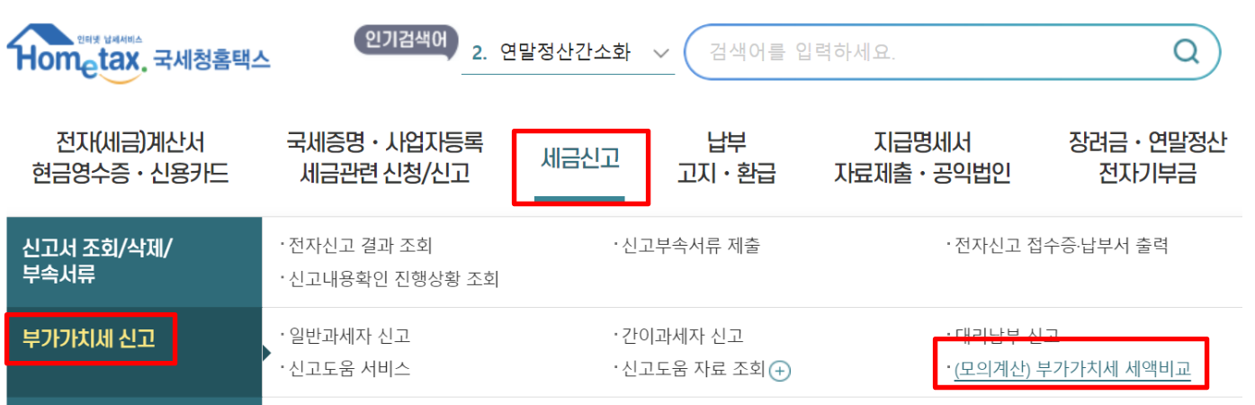 부가세 계산기는 홈택스를 비롯하여 아이홈택스, 세무회계사무소에서 제공하는 여러가지 계산기를 활용하실 수 있습니다. 홈택스에서는 아래와 같이 모의계산 메뉴를 통해 계산이 가능합니다.