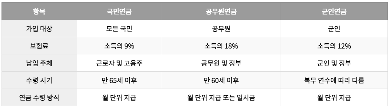 국민연금, 공무원연금, 군인연금은 각각 대상과 운영 방식에 차이가 있으며, 가입 대상의 신분과 직업 특성에 따라 혜택과 보험료 수준이 다릅니다. 국민연금은 모든 국민을 대상으로 하지만, 공무원연금과 군인연금은 그 대상을 제한하며, 더 높은 혜택을 제공하는 대신 보험료 부담이 크다는 점이 특징입니다.