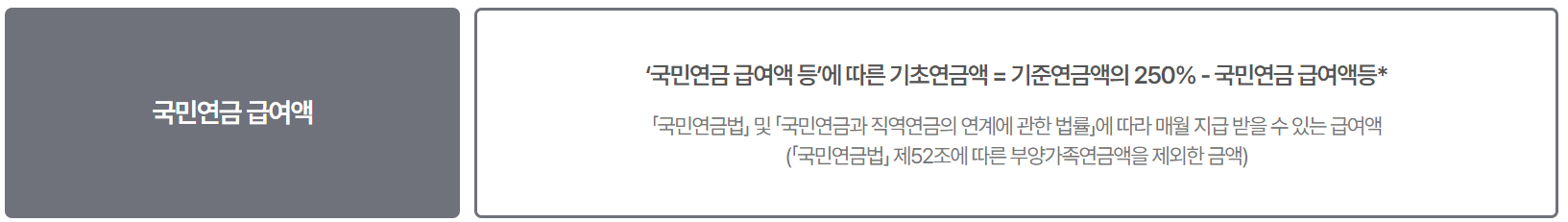 위의 4가지 경우에 해당되지 않는 경우에는 소득재분배급여에 따른 산식 또는 국민연금 급여액을 고려하여 산정됩니다. 소득재분배급여란 국민연금 급여액 중에서 기초연금적인 성격을 가진부분으로 개인별 기초연금액을 결정하는 기준이 되는 급여입니다.
