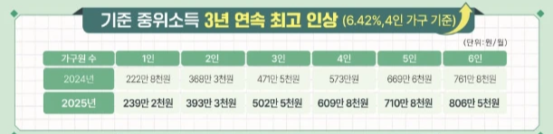 - 4인 가구 기준: 609만 7,773원 (6.42% 인상)