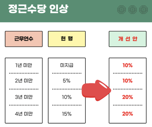 - 저연차 공무원들의 이탈을 방지하고, 근무 의욕을 높이기 위한 조치로 정근수당 지급률 인상