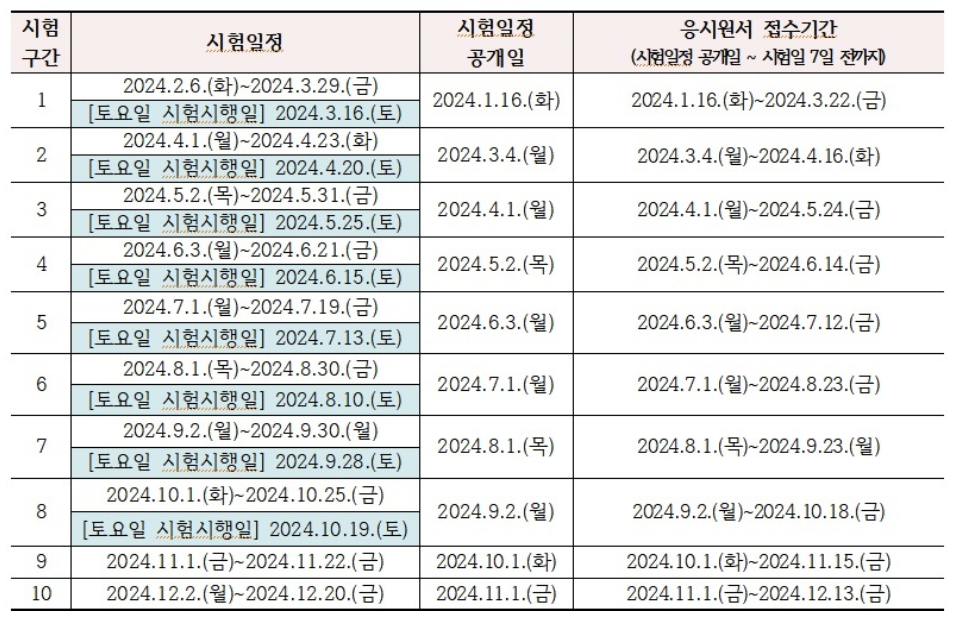 연 4회만 진행되던 자격증 시험이 상시 시험으로 변경되어 1년에 10회로 시험이 진행됩니다. 토요일에도 시험이 진행되고 있으며 자세한 일정은 아래 표를 통해 안내 드리겠습니다.