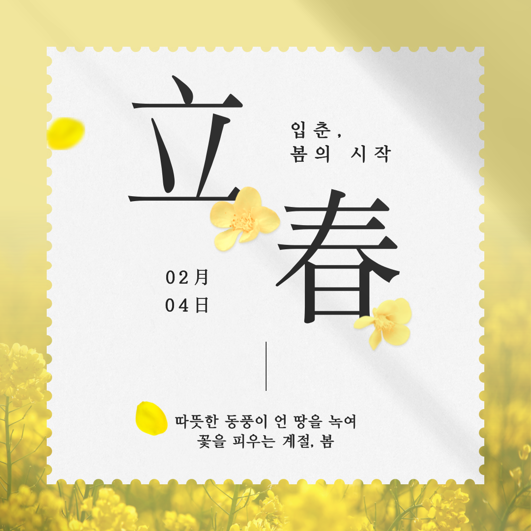 - 입춘(立春): 봄이 시작됨을 뜻하며, 24절기 중 첫 번째 절기입니다. 이는 겨울이 지나고 새롭게 시작되는 계절의 출발을 상징합니다.