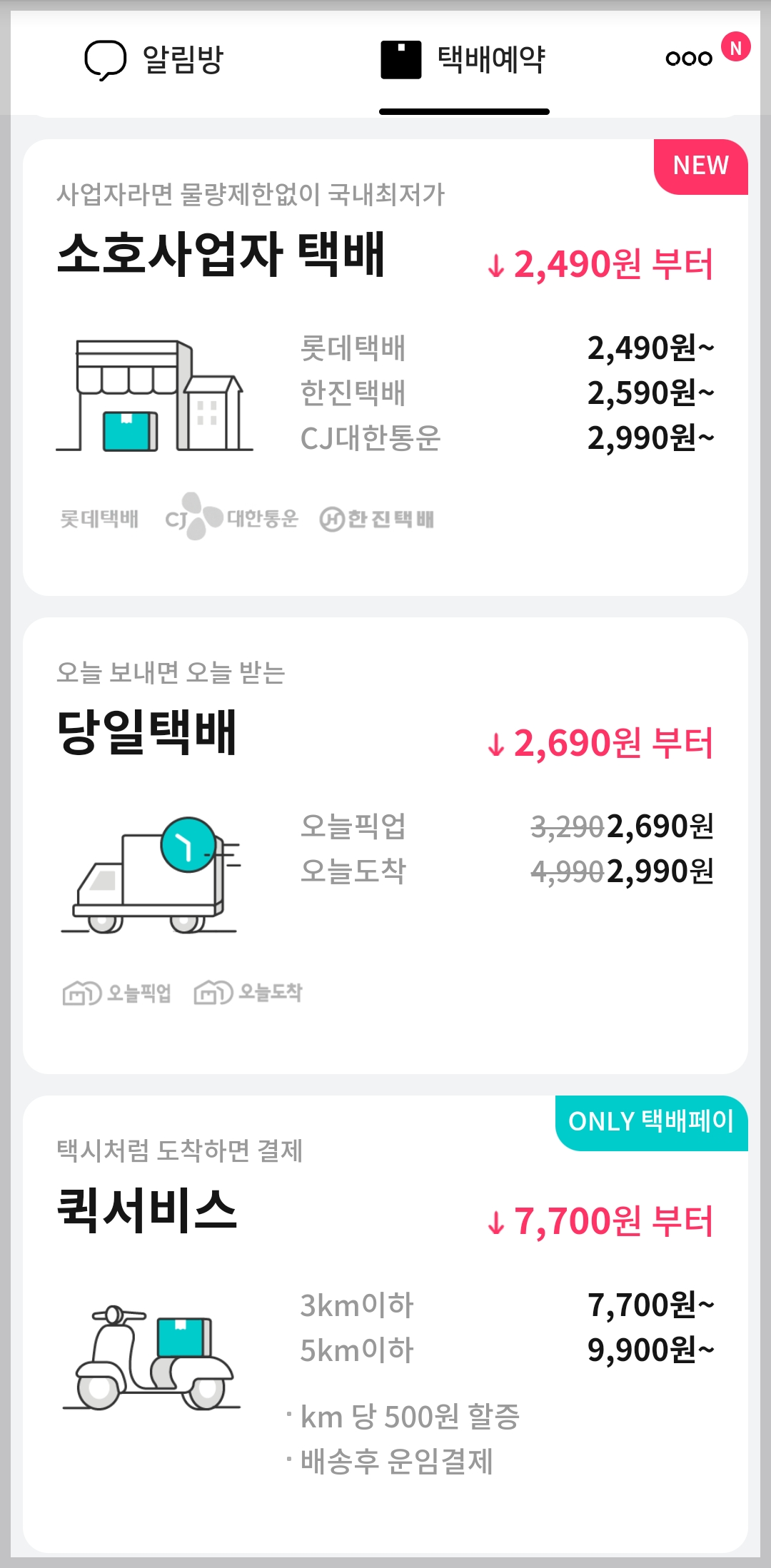 택배 파인더 앱을 다운받으시면 아래와 같이 다양하게 택배를 이용할 수 있는 방법이 나옵니다. 편의점택배, 방문택배, 당일택배, 퀵서비스까지 여러가지 방법으로 택배를 발송하실 수 있습니다.