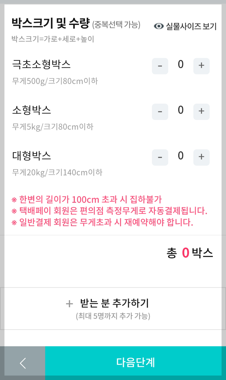 원하시는 편의점을 선택하시고 아래의 다음단계를 누르면 보내는 사람의 주소와 받는 사람의 주소를 입력하고 물품정보를 입력하는 화면이 나옵니다. 여기에서 물품정보, 박스의 크기와 수량을 선택합니다.