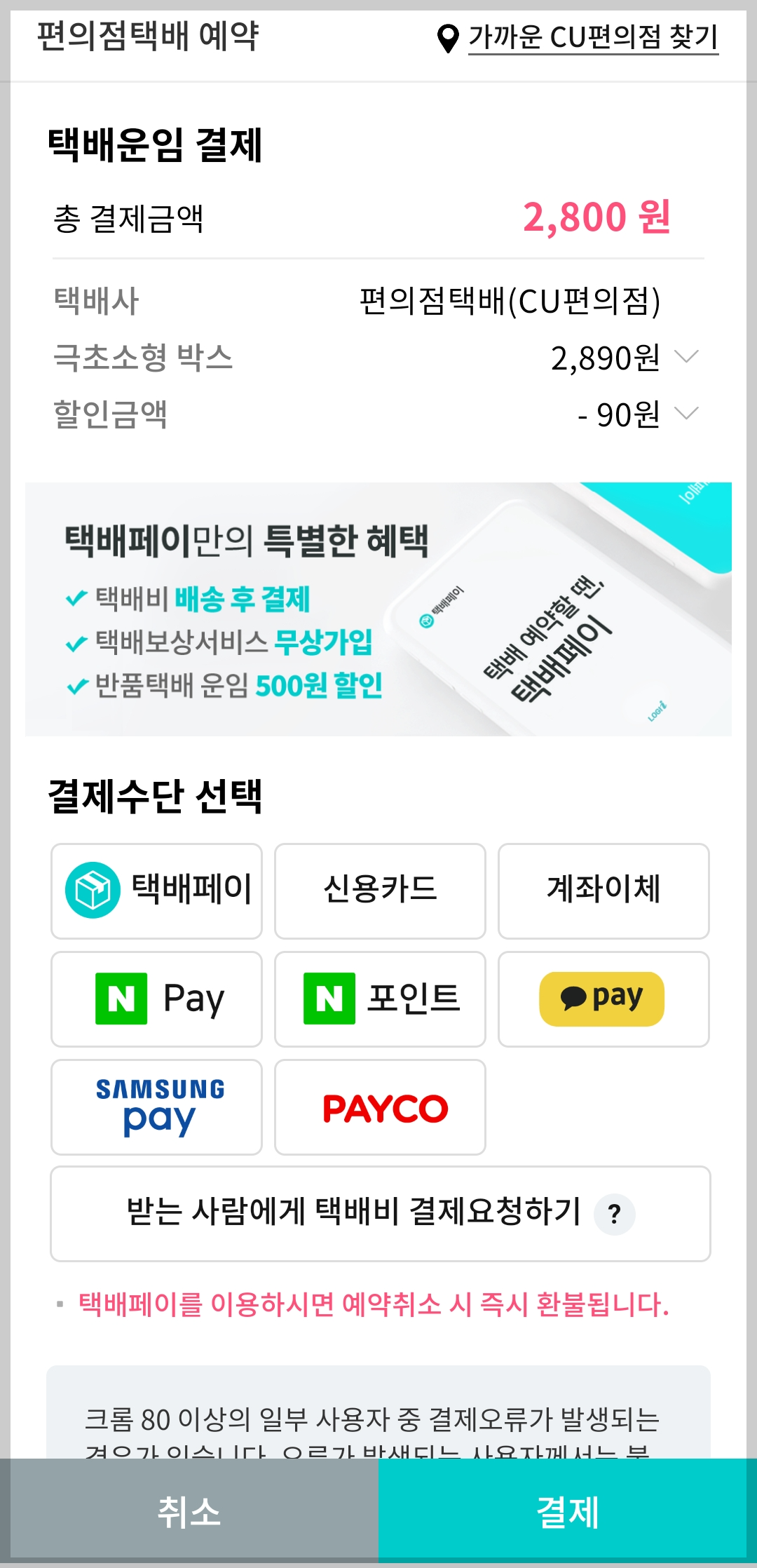 여기까지 입력하시면 이제 거의 택배 예약이 거의 끝나갑니다. 마지막 단계인 결제만 하시면 됩니다. 택배운임을 결제하는 화면으로 이동하면 결제수단을 선택 후 결제하시면 편의점 택배예약이 완료됩니다.