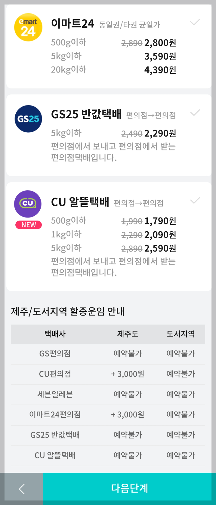 편의점 택배 메뉴를 클릭하면 아래와 같이 편의점별 운임이 확인됩니다.