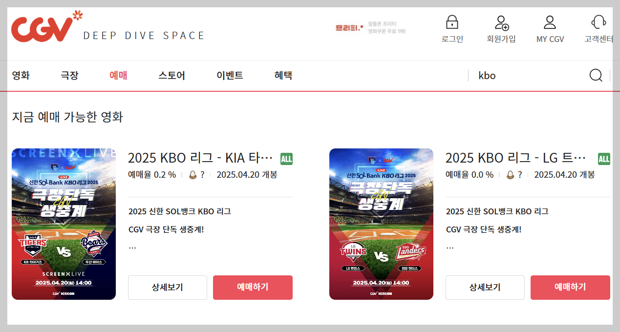 지금 바로 CGV 앱 또는 홈페이지에 접속해 ‘KBO’를 검색하고 생중계 티켓을 예매해보세요!