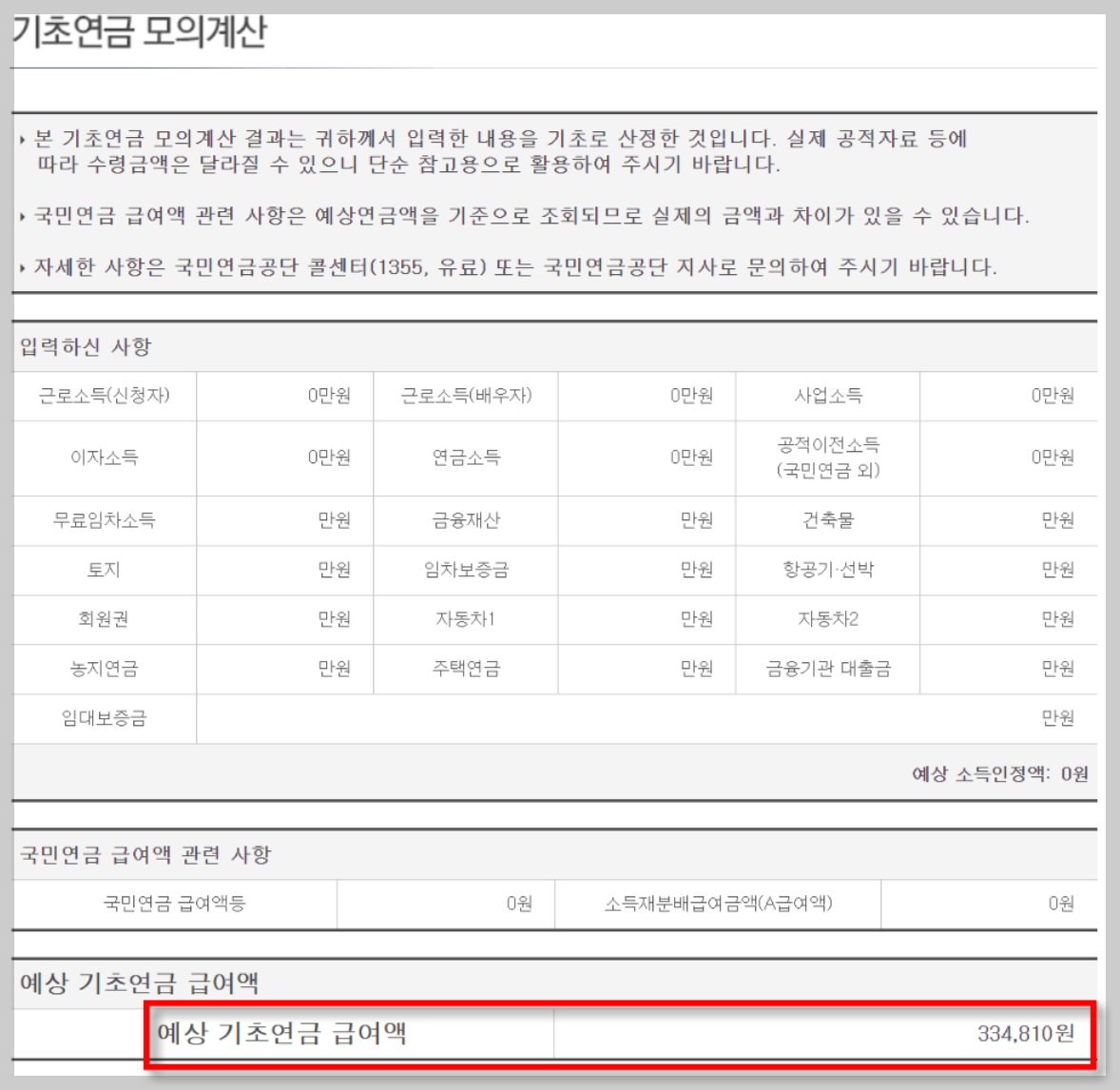 모든 내용을 최대한 자세하게 작성하셔야 기초연금 실제 수령액에 가까운 금액을 확인하실 수 있습니다. 아래는 근로소득 0원, 보유재산 0원, 국민연금 급여액 0원인 경우 지급받을 수 있게 되는 기초연금 급여액입니다. 최대 급여액 334,810원입니다.
