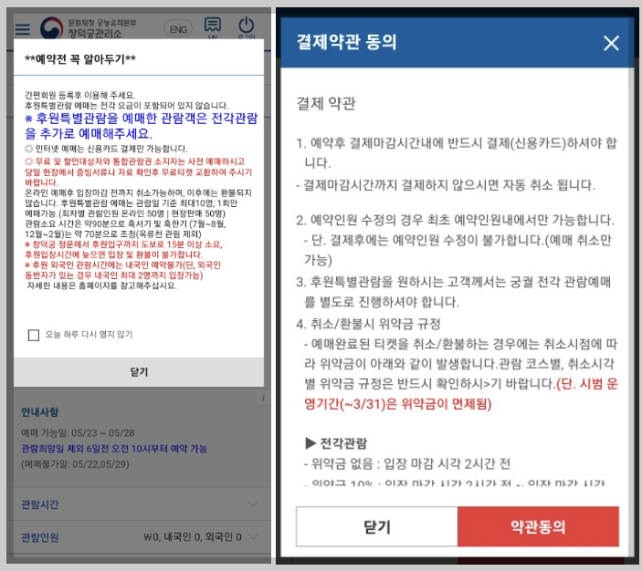 창덕궁 후원 예약은 문화재청 궁능유적본부 사이트에서 가능합니다. 예약모아보기> 창덕궁을 선택하시면 관람희망일 6일전에 오전 10시부터 선착순으로 예약이 가능합니다. 결제마감시간 내 결제까지 완료해야 예약이 됩니다.