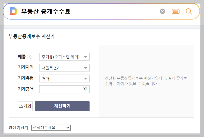 부동산 중개 수수료 계산은 쉬운 것 같이 보이나 상한요율 적용이 다소 어렵습니다. 따라서 많이 이용하시는 검색업체인 다음이나 네이버를 이용하시면 부동산 중개수수료를 간단하게 계산하실 수 있습니다.