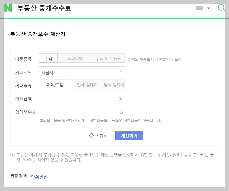 매물종류와 거래지역을 선택하시면 자동으로 중개수수료율이 적용되어 나오므로 빠르게 계산이 가능합니다.