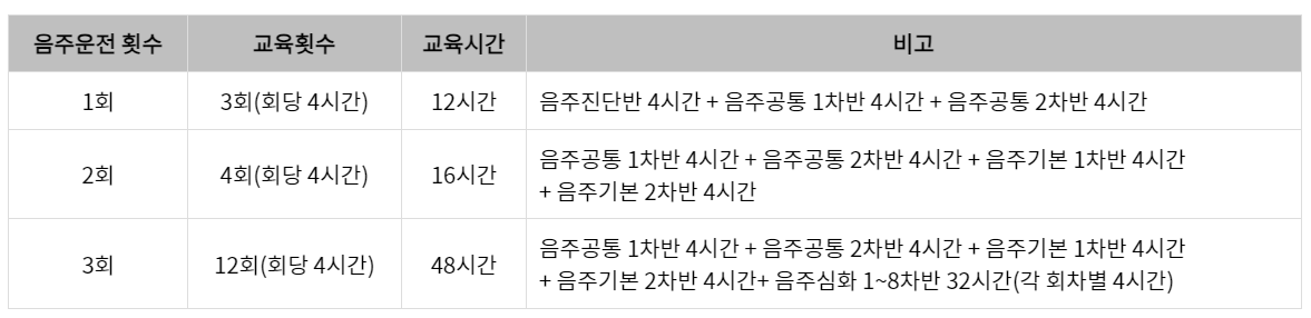 음주운전 교육은 과거 5년 이내에 음주운전으로 적발된 횟수에 따라 교육 시간이 달라집니다.
