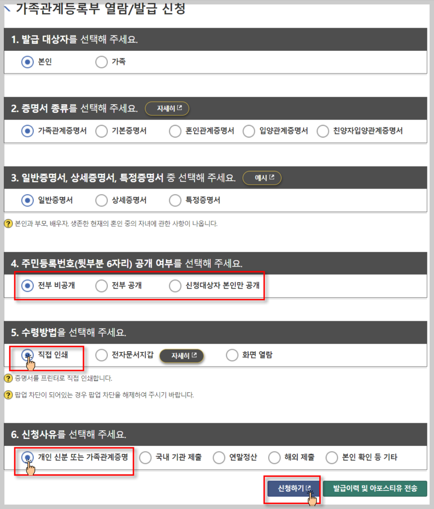 4번 주민번호 공개여부와 5번 수령방법, 6번 신청사유를 선택하신 후 신청하기 버튼을 눌러줍니다.