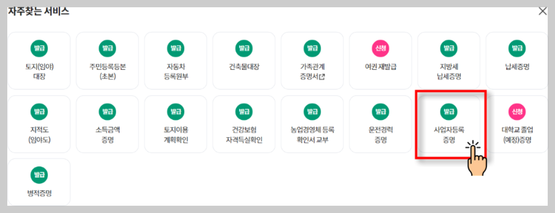 2. 모아보기 메뉴에서 사업자등록증명 신청 메뉴 클릭