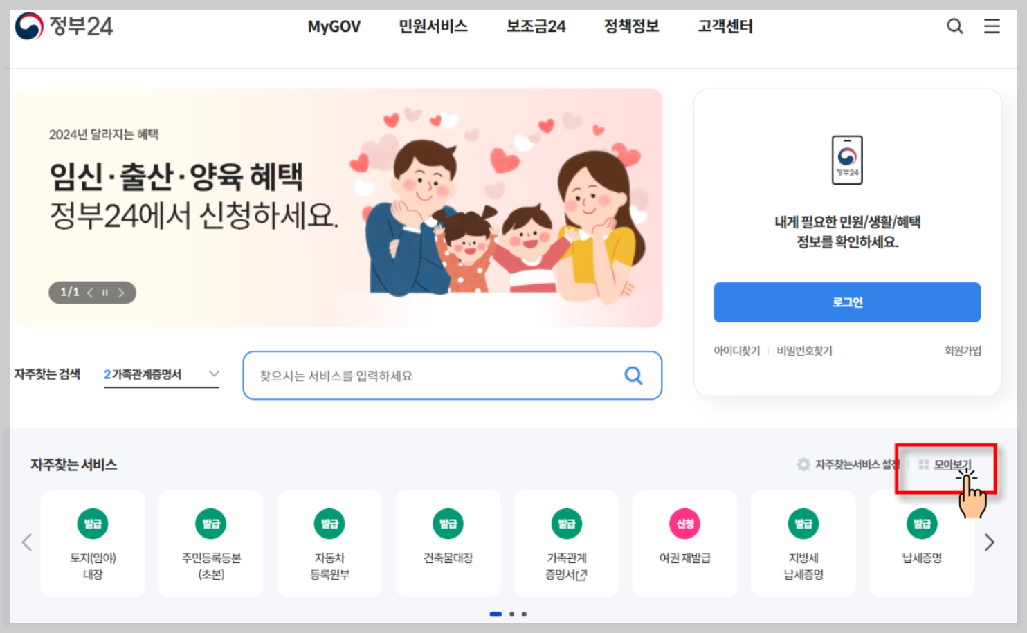 1. 정부24 사이트에서 중간 부분에 모아보기 클릭
