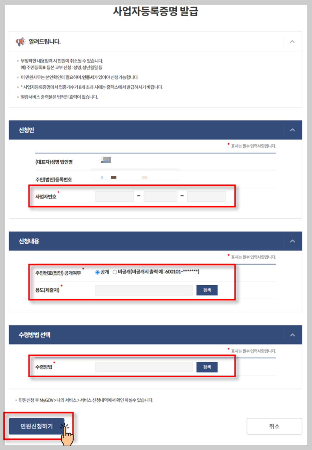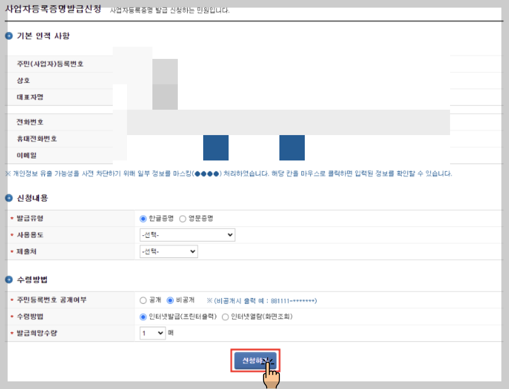 4. 아래와 같이 사업자등록증명 발급 화면이 나오면 사업자번호와 용도 및 수령방법 작성