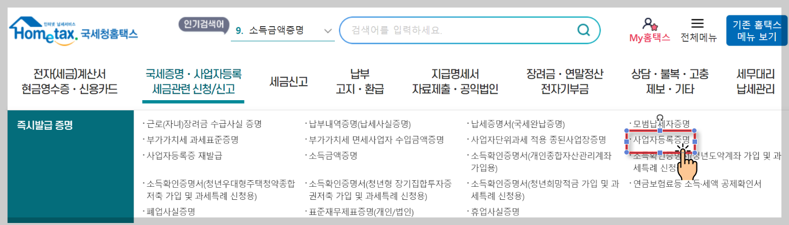 홈택스에서 발급을 하시려면 사업자등록증명원 발급은 홈택스 민원증명> 사업자등록증명 메뉴를 통해 발급받을 수 있습니다.