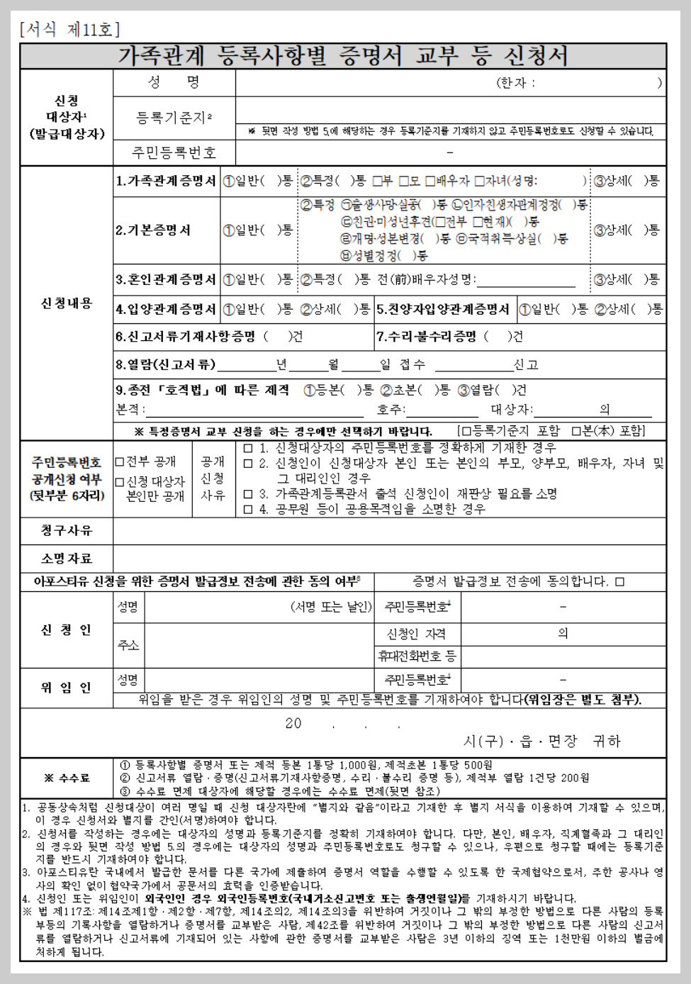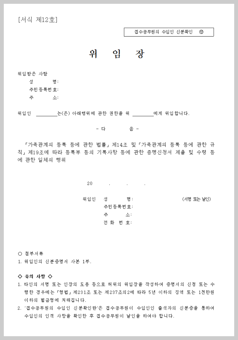 특히 형제자매의 배우자 (올케, 시누, 매형 등)의 가족관계증명서를 발급하게 된다면 위임장이 반드시 필요합니다.
