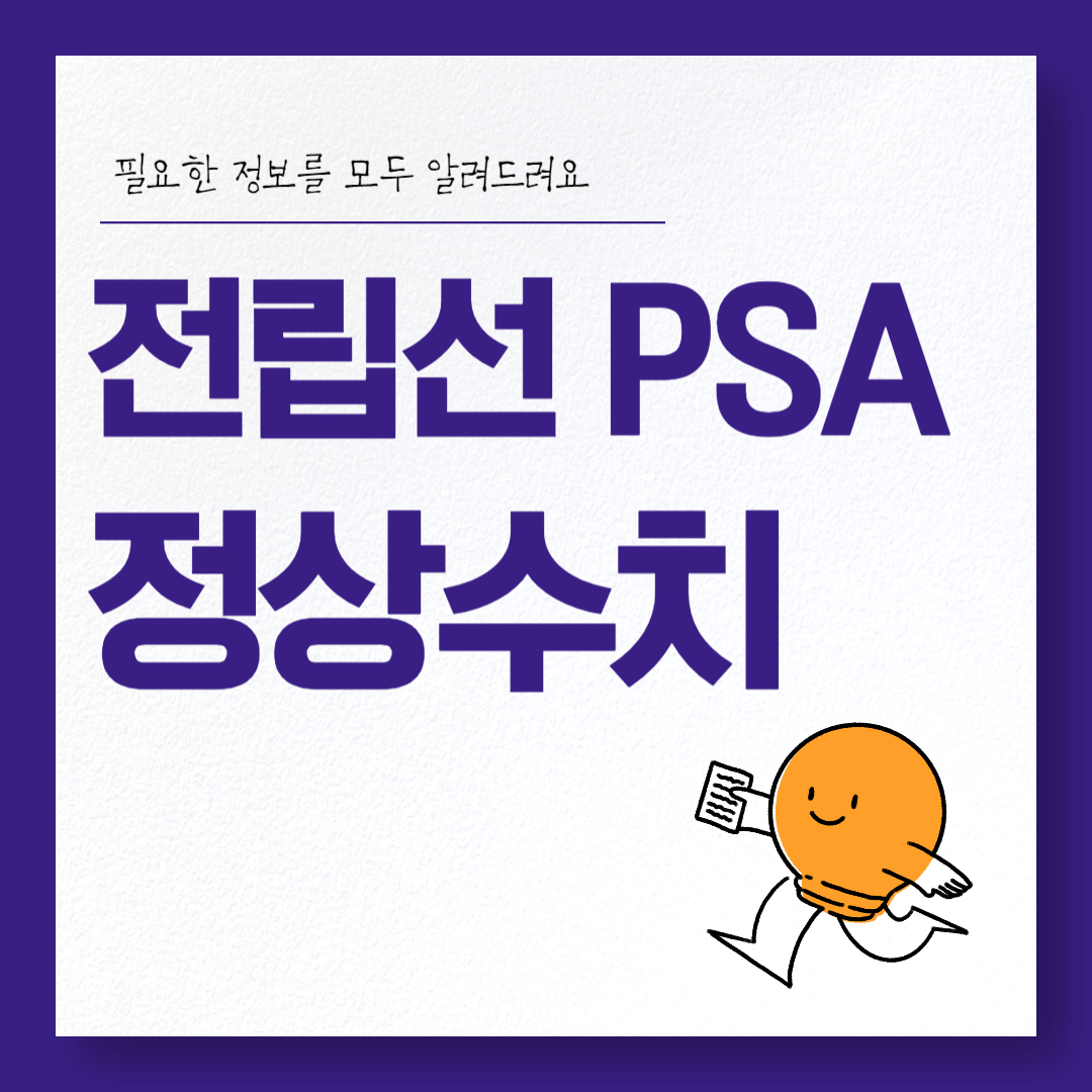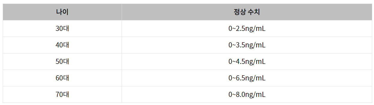 PSA 정상수치는 30대에 2.5 ng/mL이내, 40대는 3.5 ng/mL이내, 50대는 4.5 ng/mL이내, 60대는 6.5 ng/mL, 70대는 8.0 ng/mL이내로 연령에따라 정상범위가 달라지게 됩니다.