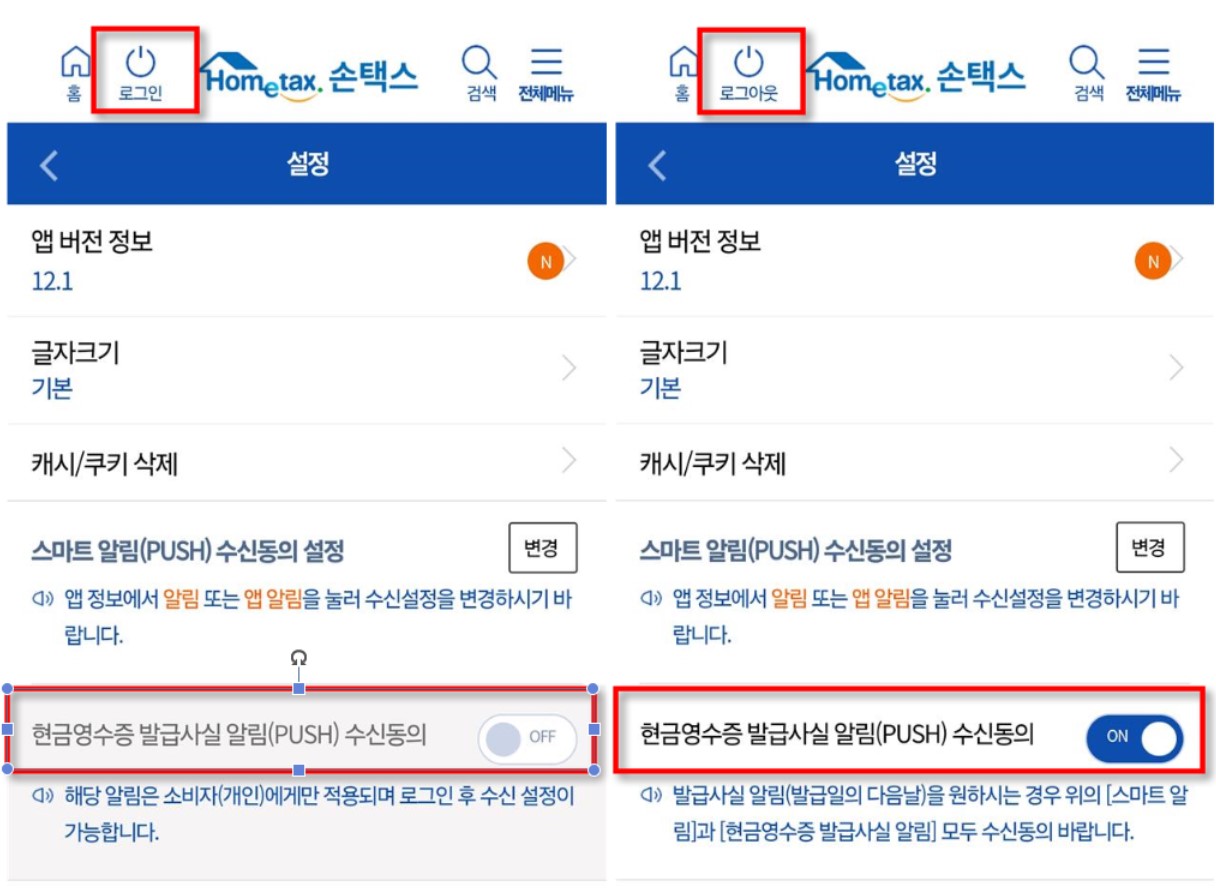 설정 화면 아래에 보시면 현금영수증 발급사실 알림 수신 동의가 OFF로 되어있는 것을 보실 수 있습니다. ON으로 변경하려면 로그인을 하여야 합니다. 로그인 후 ON으로 변경하시면 이제부터 다음날 현금영수증 발급 알림을 받으실 수 있습니다.